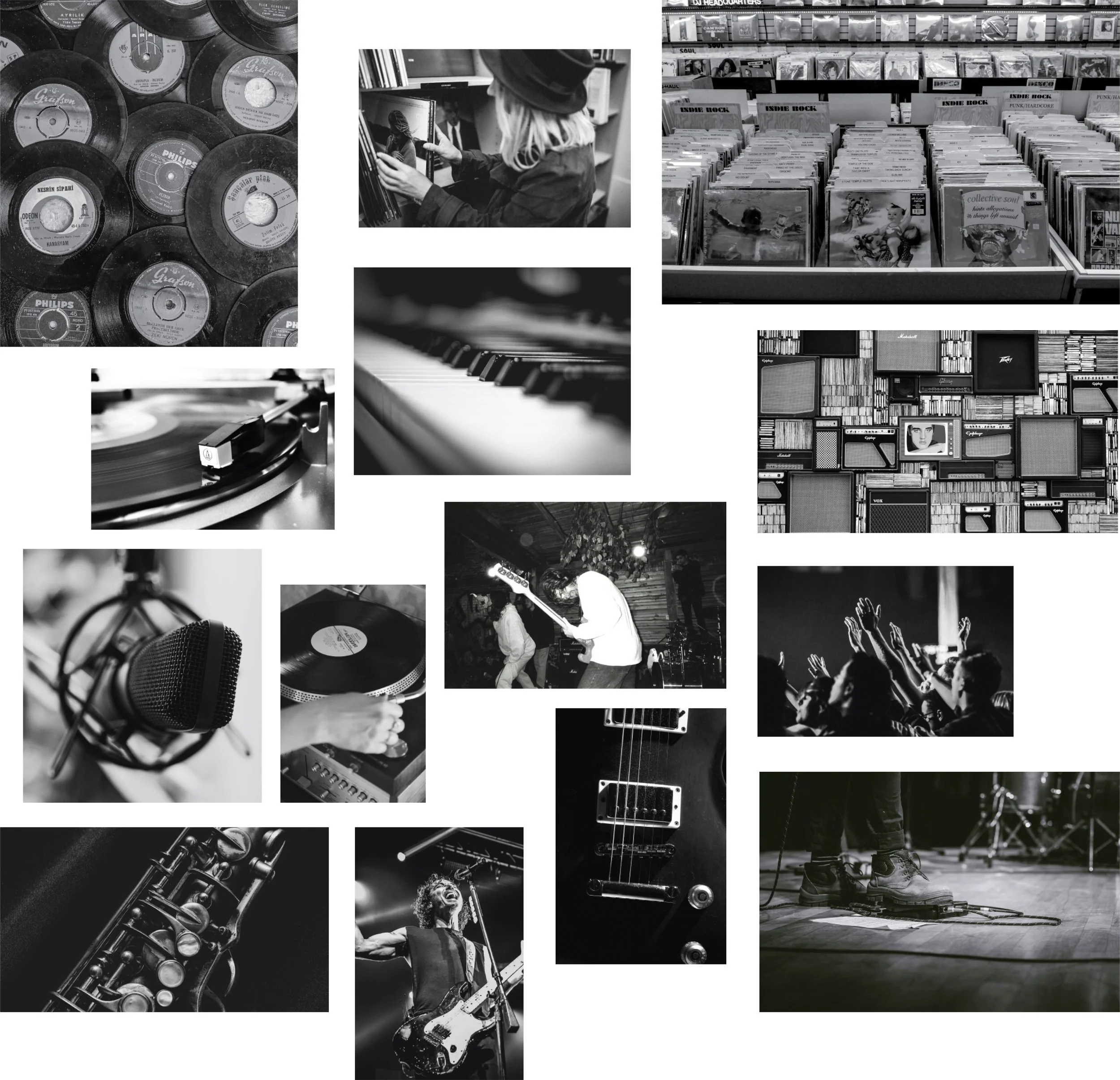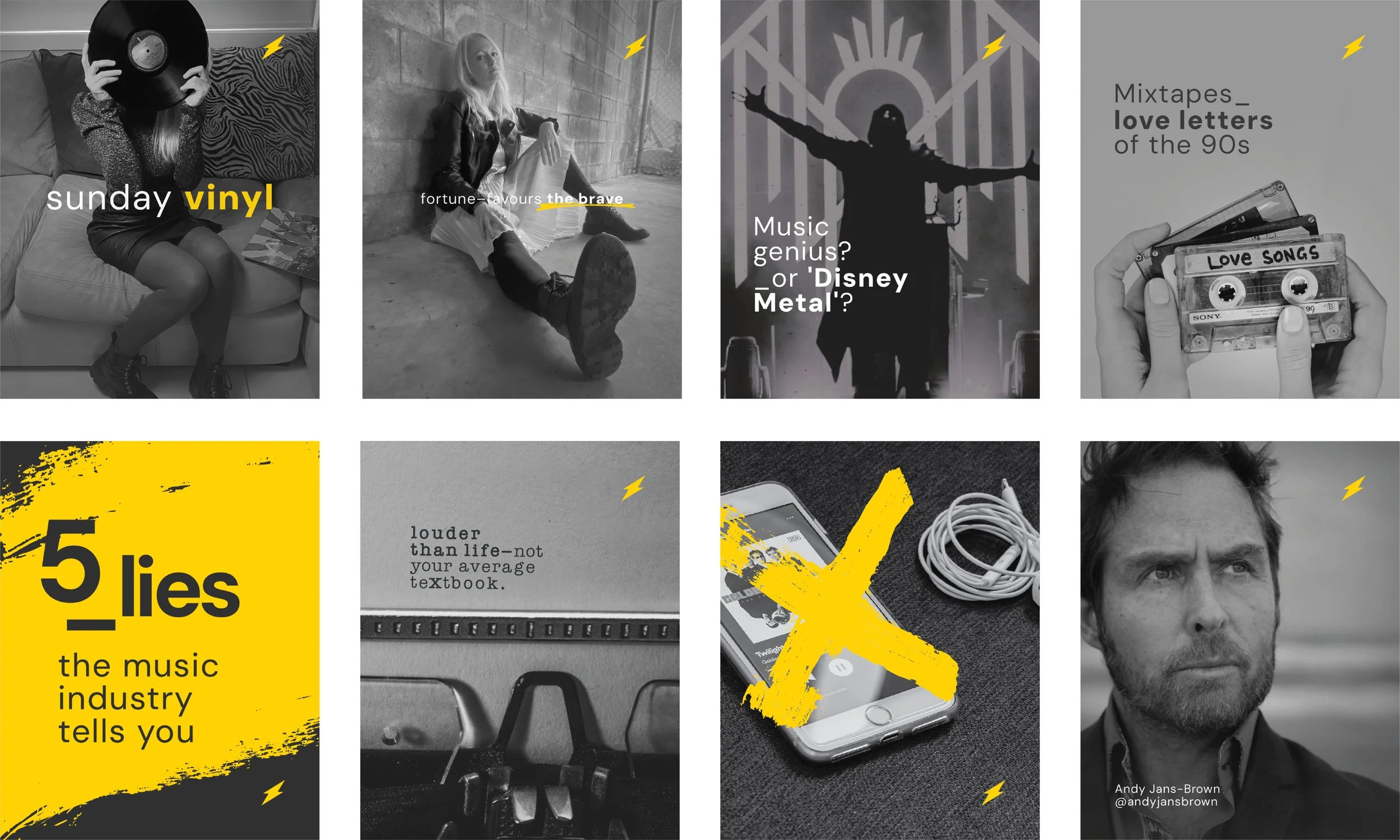 Photography was treated as an extension of the brand voice, not decoration. Black and white portrait photography centres Emily herself, presence, expression, and authenticity, reinforcing trust while maintaining edge. Supporting imagery leans into music, process, and creative culture, chosen to feel lived-in rather than staged. Hand-drawn marks, scribbles, and graphic interventions bring energy and imperfection into the system, helping the brand feel human, expressive, and engaging without losing clarity or consistency.